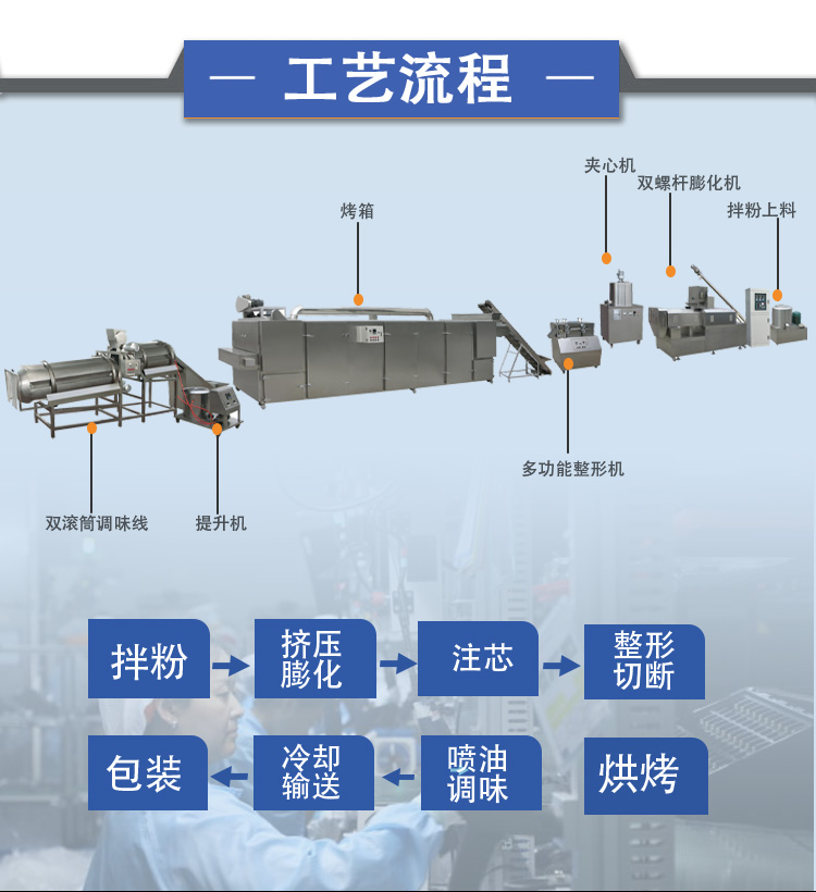 膨化與夾餡:將混合后的物料送入膨化機,通過高溫高壓使其膨化,同時通過夾心模均勻注入餡料,形成膨化酥