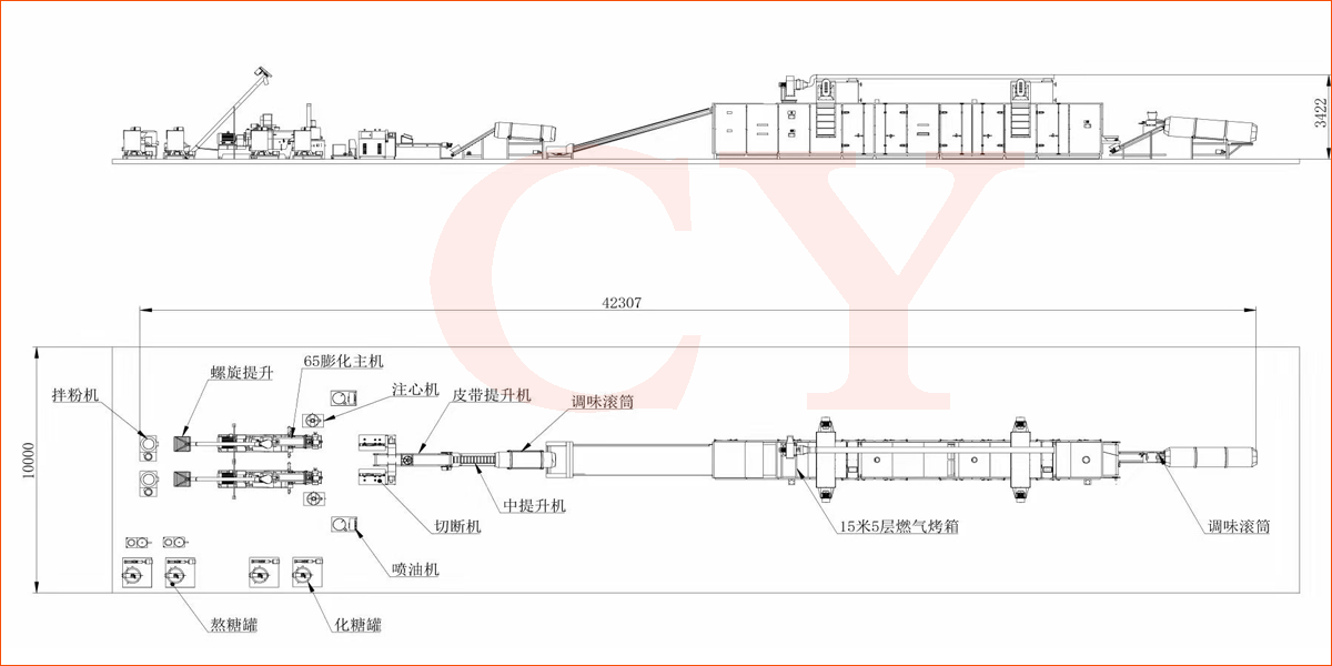 拌粉機(jī)→螺旋上料機(jī)→雙螺桿膨化機(jī)→夾心機(jī)-整形切斷機(jī)→提升機(jī)→六米五層烘干機(jī)-雙筒調(diào)味機(jī)