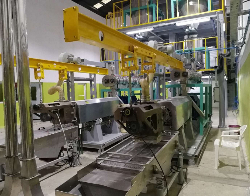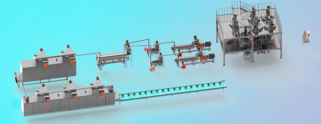自動(dòng)配料預(yù)處理-粉碎-混合-擠壓熟化-均質(zhì)-震動(dòng)烘干-二次烘干-冷卻